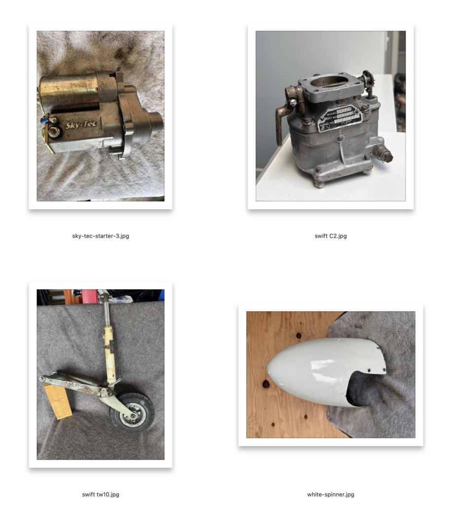 60 amp Continental engine Alternator -$300, Prop spinner – bare metal – $450 Prop spinner – white – $350, Marvel Schebler MA3-SPA Carburetor-$ 750, Scott 3250 tail wheel, 8″ pneumatic tire with shock strut – 1,400, Stainless exhaust pipes (set of 6) – $450, Single stainless exhaust pipe – $120, Cleveland wheels and brakes – $2,200, Sky-Tec starter – $1300. All items working when removed from GC-1B.